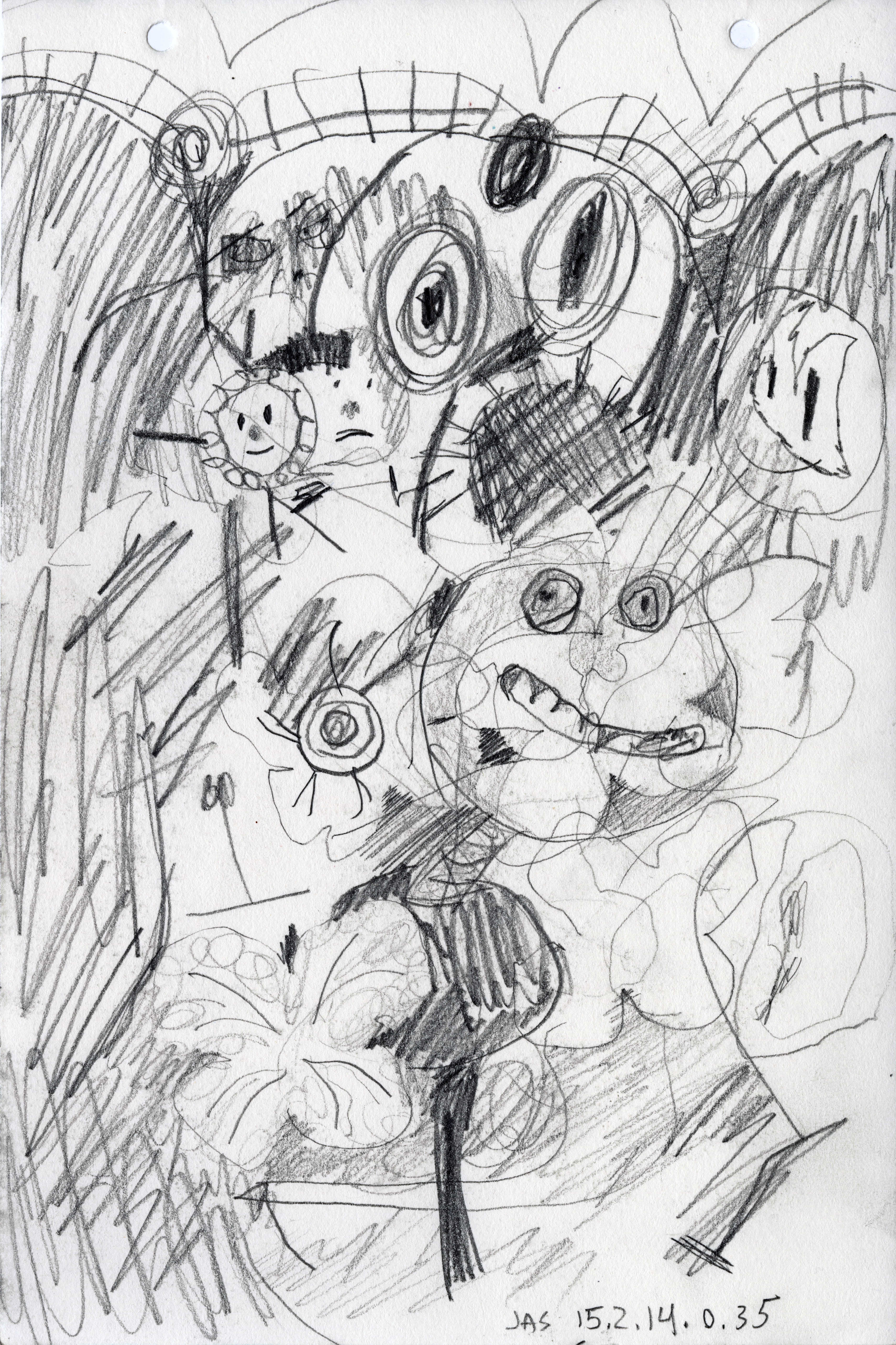 This drawing is about 6 inches wide by 9 inches tall. It was completed about 11 years ago on Saturday, February 14th, 2015 at 12:35 AM in Brooklyn, NY. I added it to Jeffrey's Drawings almost 11 years ago. Download image (2.71 MB)