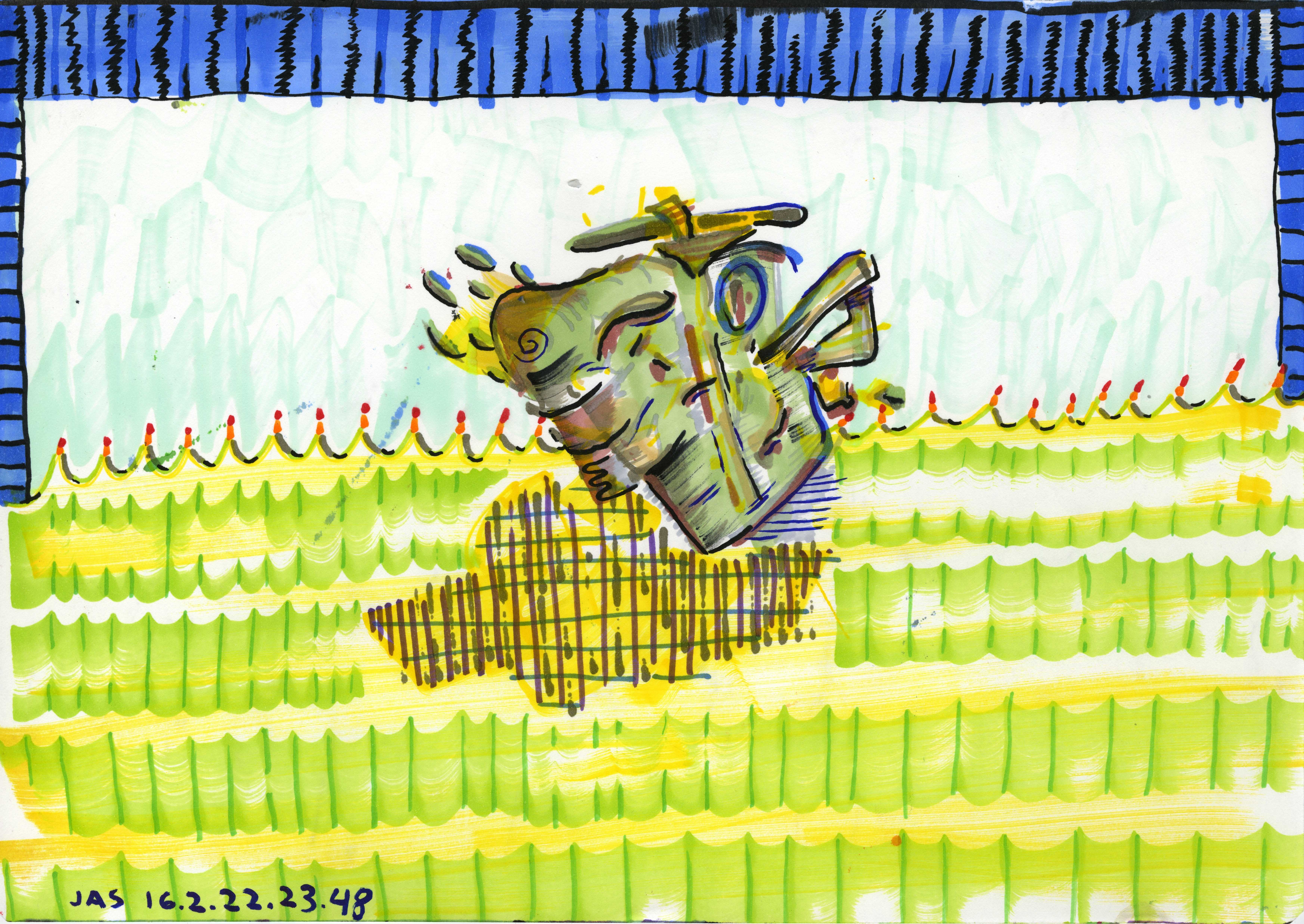 This drawing is about 12 inches wide by 9 inches tall. It was completed about 10 years ago on Monday, February 22nd, 2016 at 11:48 PM in Brooklyn, NY. I added it to Jeffrey's Drawings almost 10 years ago. Download image (1.99 MB)